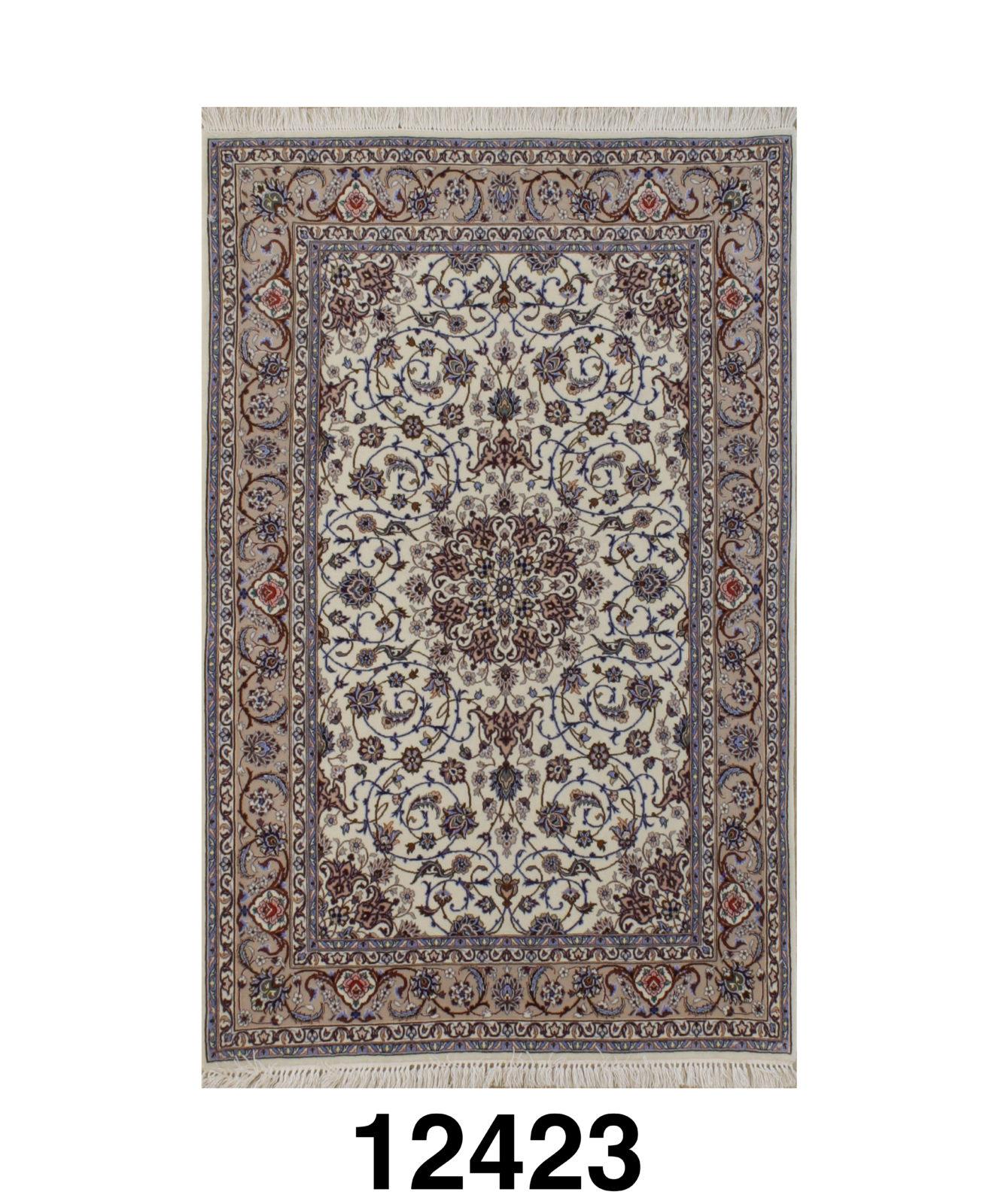 This is an original Persian rug handmade in Iran. It is made using wool pile on a silk foundation with wool highlights and a traditional Isfahan design