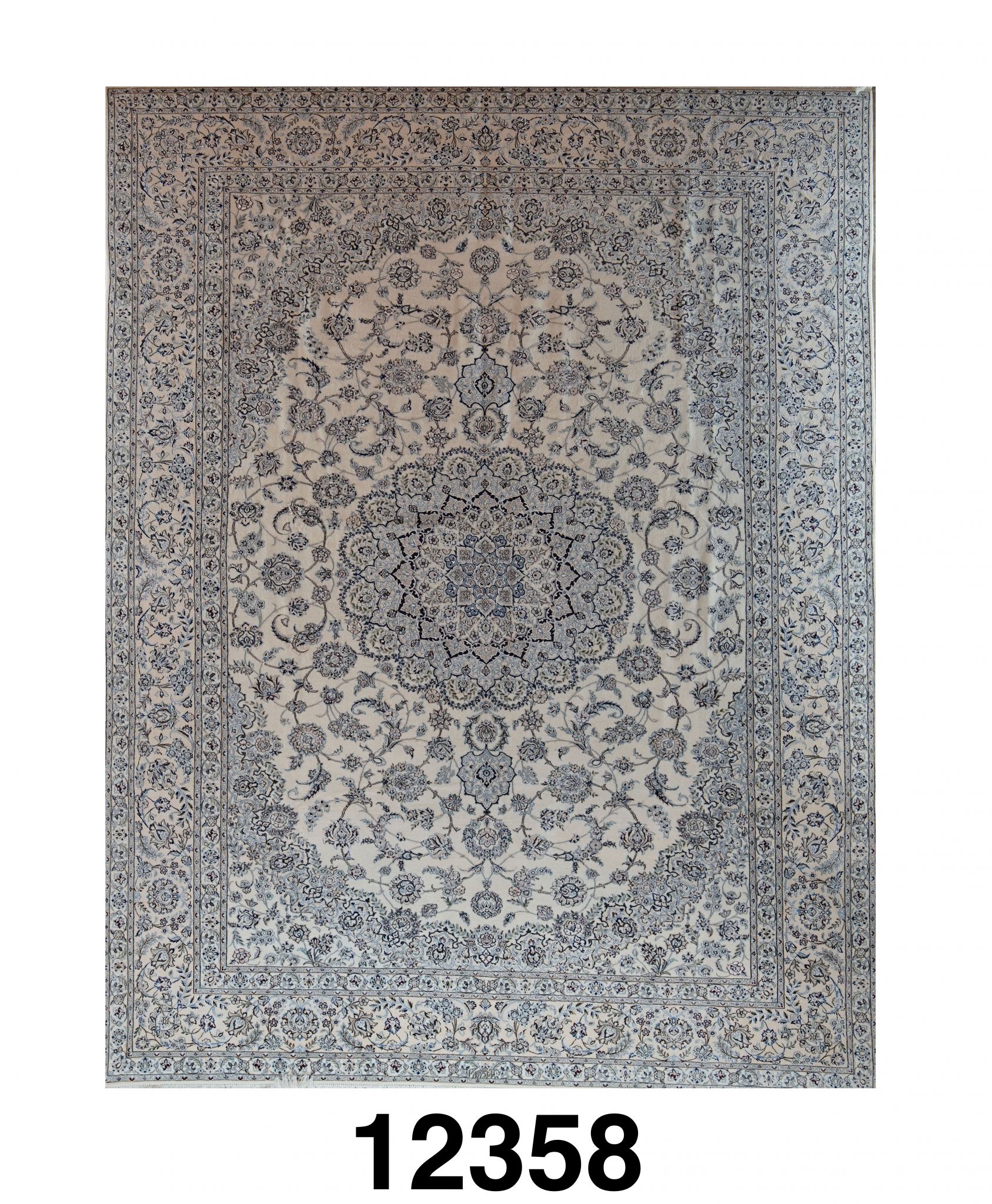 This rug is an original Persian featuring a Nain tradition design. Made with wool pile on a silk foundation with silk highlights.